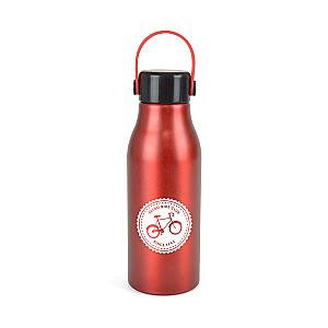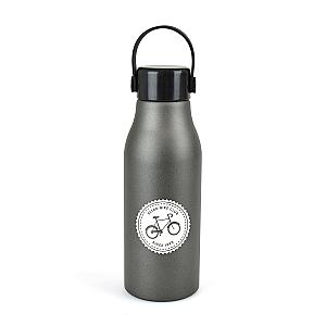 680ml singled walled aluminium drinks bottle with black PP plastic screw on lid and matching coloured silicone carry strap.