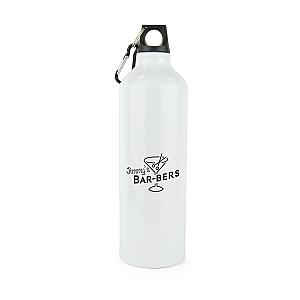 750ml single walled glossy aluminium drinks bottle with black screw on PP plastic lid and black carabiner. BPA & PVC free.
