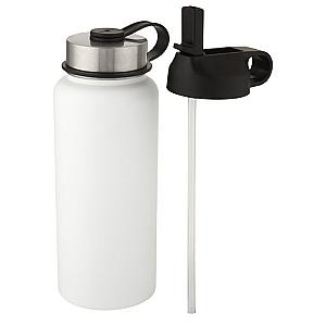Two-in-one double-walled stainless steel sport bottle with copper vacuum insulation featuring 2 lids: one lid with a straw for easy drinking and one leakproof screw-on lid with handling loop. The insulated 18/8 stainless steel construction prevents condensation on the outside of the bottle, and the on-trend powder coating finish makes it extra durable. Wide opening mouth for easy filling, pouring and cleaning. BPA-free, tested and approved under German Food Safe Legislation (LFGB). Tested and approved for phthalates content according to REACH regulations. Perfect for ice cubes. Volume capacity is 1 litre. Hand wash recommended. Presented in a recycled cardboard gift box.