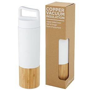 Copper vaccum insulated 18/8 stainless steel bottle that keeps drinks hot or cold for several hours. Features a trendy bamboo detail, and with the handle on top of the lid it is easy to carry around. The bottle has a wide opening making it easy to fill and clean. Tested and approved under German Food Safe Legislation (LFGB), and tested for phthalates content according to REACH regulations. Capacity is 540 ml. Presented in a recycled cardboard gift box.