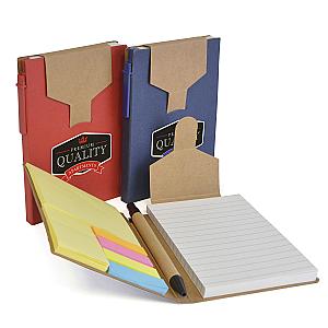 A6 notebook with 80 lined sheets, natural top flap, pen with blue ink, yellow sticky notes and flags in neon orange, pink, yellow and blue.