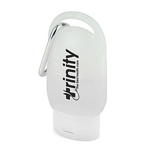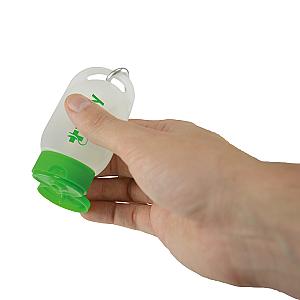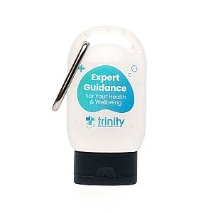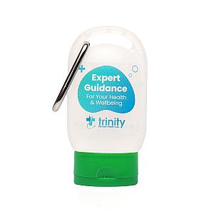 30ml pocket size hand sanitiser in a clear plastic casing with coloured lid and silver carabiner clip. Contains 62% alcohol.