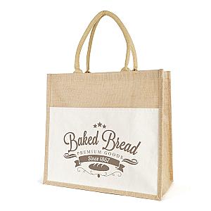 Large laminated jute shopper with short padded cotton webbed handles, 10oz cotton canvas front pocket and strong gusset.