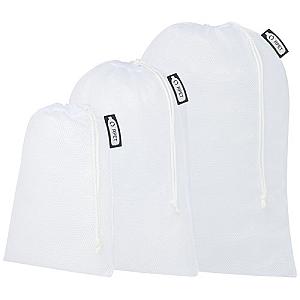 Set of three reusable bags for carrying fresh groceries, made of 100% recycled 60-65 g/m2 polyester, with handy drawstring closure. Available in sizes: 15x21 cm, 25x32 cm, 30x41 cm. Using this bag makes an environmentally friendly contribution to the reduction of plastic bags. Its durability guarantees reusability and washability, ensuring bag hygiene at all times. Decoration all over the surface with sublimation. Made in Europe.