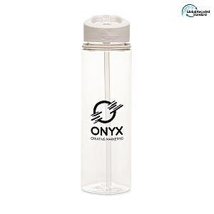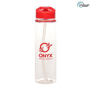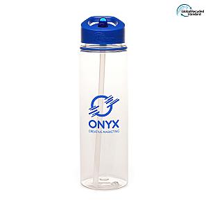 This 725ml RPET plastic drinks bottle is made with 98% Recycled Materials. This drinkware is a top choice for carrying drinks and beverages. The bottle comes with a RPP plastic secure screw top lid which prevents spills, RPS plastic coloured fold down sipper and a coloured band to match the lid. Choose from black, blue or red. The recycled transparent body comes with an extra-large branding area to customise the bottle with your company logo and also gives an option to print an individual name for added personalisation. Make your customers feel personally connected to your brand by offering these BPA and PVC free, personalised bottles. Order now!