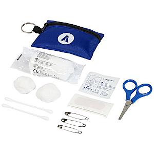 Convenient polyester pouch with keyring that holds 16 pieces of first aid supplies. The kit contains a pair of scissors (9 cm), 2 skin cleansing swabs, 1 elastic bandage (4 metre x 6 cm), 2 cotton balls (0.5g), 3 safety pins (3.6 cm), 5 plasters (45x19 mm), and 2 cotton pins (8 cm). Great for travelling, festival, events, and other outdoor activities, and has a large decoration area. A first aid kit is regarded as a medical device and is governed by 93/42/EEC, based on the intended use: “diagnosis, prevention, monitoring, treatment or alleviation of disease”. This medical device belong to CLASS I, Is.