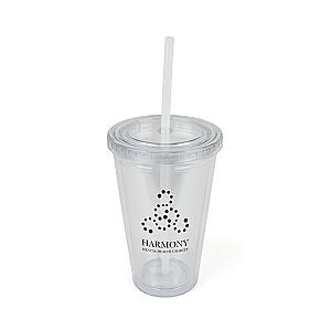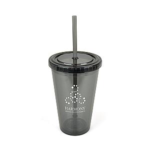500ml double walled, AS plastic tumbler with matching straw and screw on lid. Straw not suitable for hot drinks. BPA free. Available in translucent black and clear.