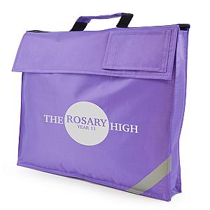 420D polyester school bag with reflective strip on bottom corner. Includes hook and loop closure close compartment with 2 small black flap pouches