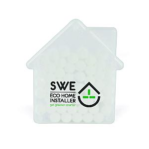 Plastic house shaped mint card with approx. 50 sugar free mints per card (approx. 8g). Ingredients sticker and seal included. Gluten free and Vegetarian, not suitable for Vegans due to bees wax.