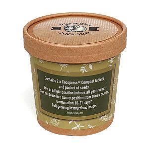 This eye-catching grow kit includes everything you need to start your gardening journey. Inside a 12oz biodegradable natural natural paper cup, you'll find two CocopressĀ® compost tablets, a seed packet with 5 varieties to choose from: Kitchen Herbs, Chives, Parsley, Basil, Mint and Fennel along with detailed planting instructions. The cup is topped with a custom-branded paper lid, making it perfect for gifts, promotions, or personal use. Grow green and give back to the planet with this sustainable and easy-to-use planting solution!