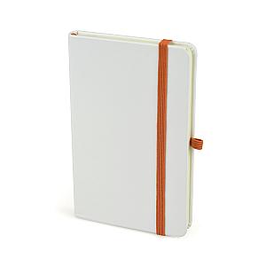 A6 white PU soft finish 80 sheet lined notebook with coloured bookmark, back pocket and coloured elastic pen loop and coloured elastic closure