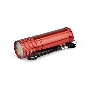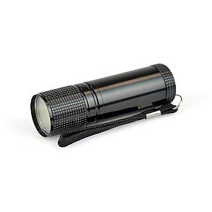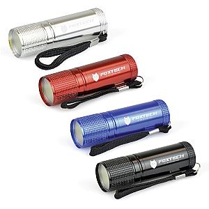 COB LED aluminium torch with black wrist strap and push button activation. Batteries included