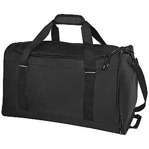 Sustainable GRS certified RPET duffel bag made with 55% recycled materials. Features a large zippered main compartment, a reinforced base panel, a side mesh pocket, and an expandable wet/dry zippered pocket. Comes with a small zippered internal pocket for organization, removable and padded shoulder strap, grab handles with padded velcro closure, and an extra grab handle on the bottom right side.