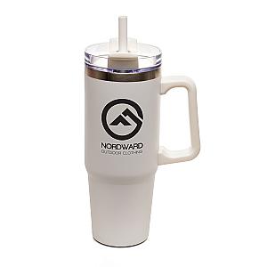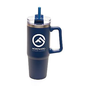 Stay stylish and well-hydrated on the move with our trendy 900ml travel mug. This convenient size allows for fewer refills, making it the perfect on-the-go companion and a practical car and office accessory, to ensure hydration whenever you need, whether you desire hot or cold temperature. Featuring a recycled plastic black slider, recycled PE plastic coloured straw, and clear recycled AS plastic spill-prevention lid, with a built-in recycled PP handle for taking on the go. With its scuff-resistant powder coating, our travel mug can be used repeatedly, making it a lasting advertisement for your company logo and message. Enjoy maximum visibility and brand exposure as your customers use it over and over again. The perfect giveaway for trade shows, corporate events and even the perfect premium gift with individual name engraving too! Why wait… order yours today and enjoy keeping beverages at an optimum temperature for longer periods of time! BPA & PVC free.