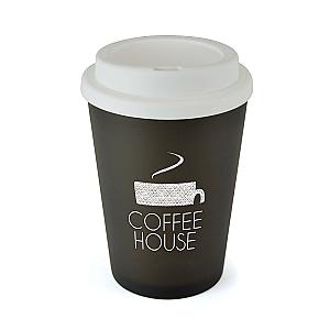 350ml double walled, coloured, PP plastic frosted take out mug with a white plastic screw top lid with sipper. BPA & PVC free