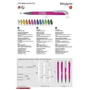 A translucent push action ball pen from Klio Eterna featuring a metal nose cone. Made in Germany using climate-neutral production and 100% green electricity. 20% of the plastic used to produce this product is made from recycled ABS plastic! This promotional pen is made to order and you can customise the individual parts of the pen. You can pick between a wide range of 13 different standard colours and from 3000pcs you can even pantone match the whole pen! This push action ball pen is sure to stand out, not only with your colour combinations, but also the sleek and precise design will catch the attention of anyone. Supplied with a quality Silktech refill, made of recycled PP material, that is guaranteed to have a writing length of 3000m and can be supplied in blue or black ink. A combination of precise design and engineering oozes quality and ensures a writing experience like no other. Get in touch today and order now!