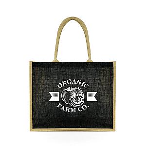 Landscape jute shopper with coloured front and back, natural gusset and trim, padded cotton webbed handles and PP lamination.