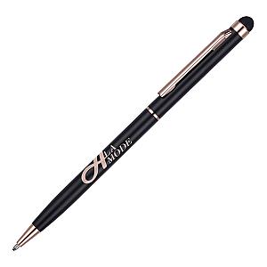 An elegant, slim twist action ball pen with a soft stylus at one end for use on all those soft touch devices. The on trend rose gold trim can be partnered with our specially formulated rose gold print for a truly beautiful finish!