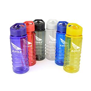 550ml single walled translucent coloured PET plastic drinks bottle with fold down drinking straw and ridged bottom half for grip. PP plastic lid, AS plastic sipper and PE plastic straw. BPA & PVC free. Available in 6 colours. This product replaces MG0707 & is now made from PET material.