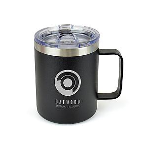 350ml double walled stainless steel travel mug with integrated handle, secure clear AS plastic push on lid and a sliding sipper to prevent spills on the go. BPA & PVC free.