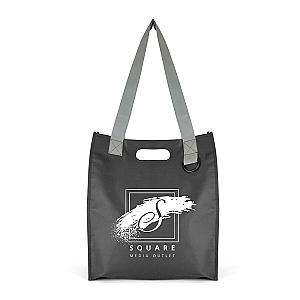 Recycled 80gsm non woven shopper with long grey handles, integrated carry handles and ring attachment.